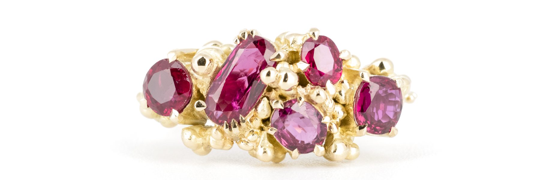 Pauline werd 21 en wat is er nu een beter cadeau dan een op maat gemaakt juweel? Ze wist perfect wat ze wou, een juweel gemaakt met de robijnen van opa in een jasje van geel gouden bolletjes en niets te strak. Elke robijn zit in een op maat gemaakte zetting en elke zetting is volledig uniek, let maar op de grifjes rond de steen, van 6 naar vier stuks naar asymmetrisch en symmetrisch. Elk klein detail wordt besproken en ontworpen samen met de klant. Pauline en haar mama waren dan ook heel erg blij met dit eindresultaat.