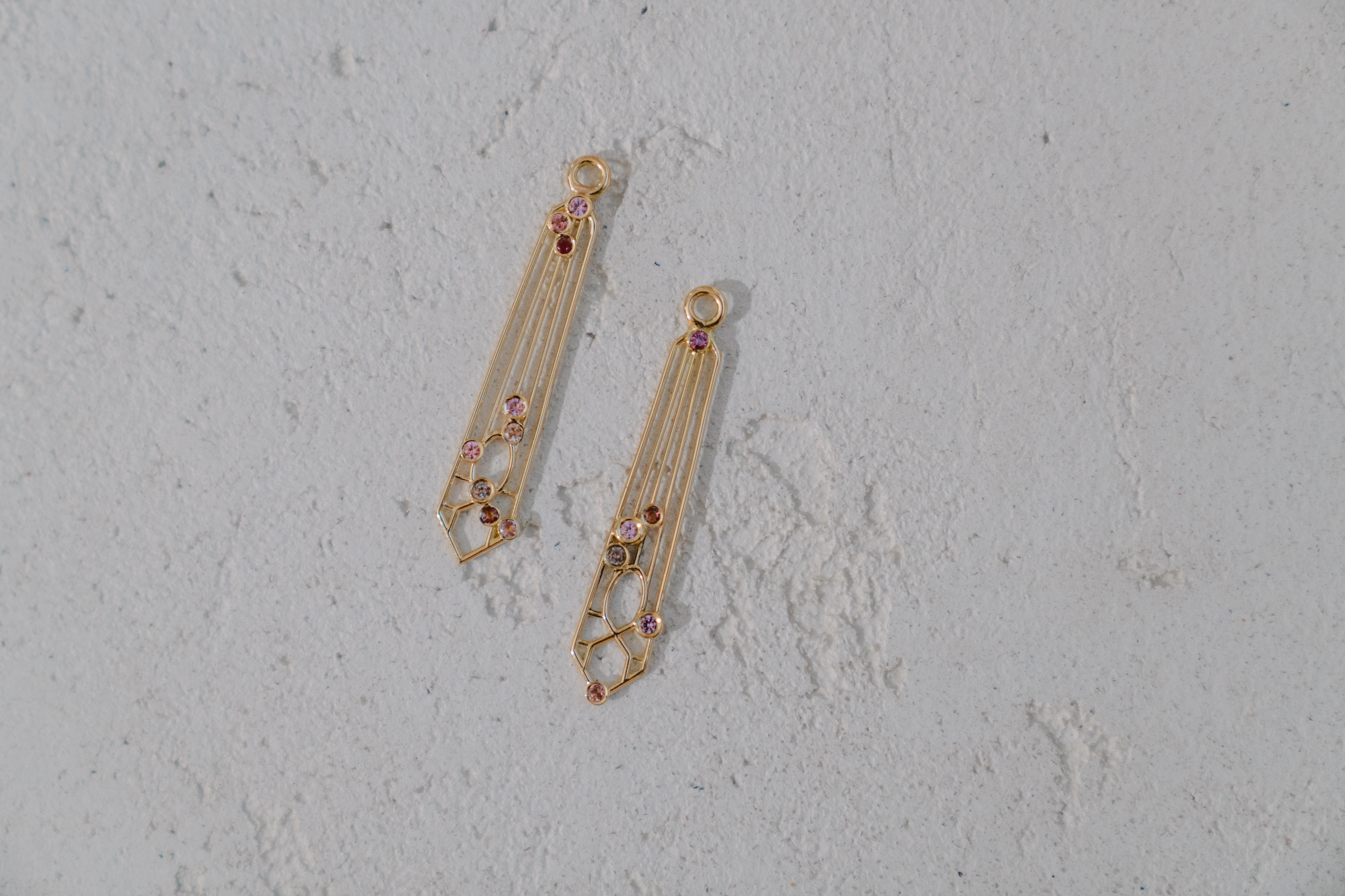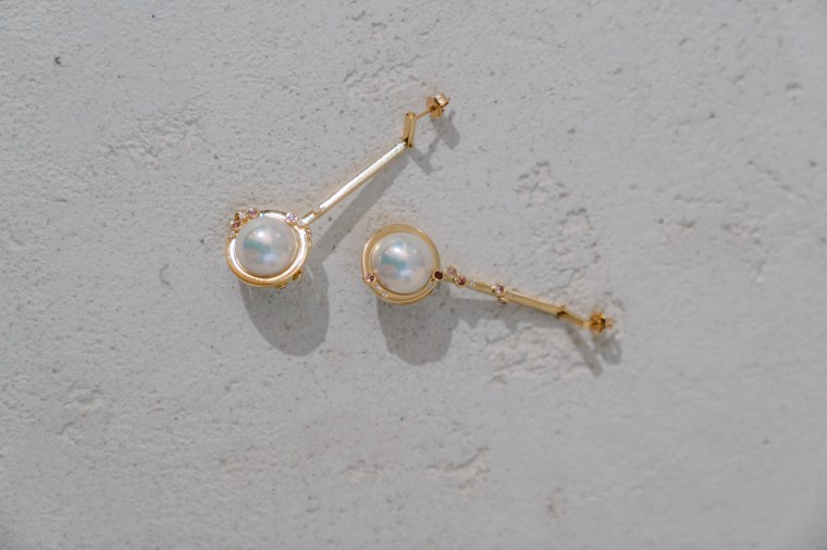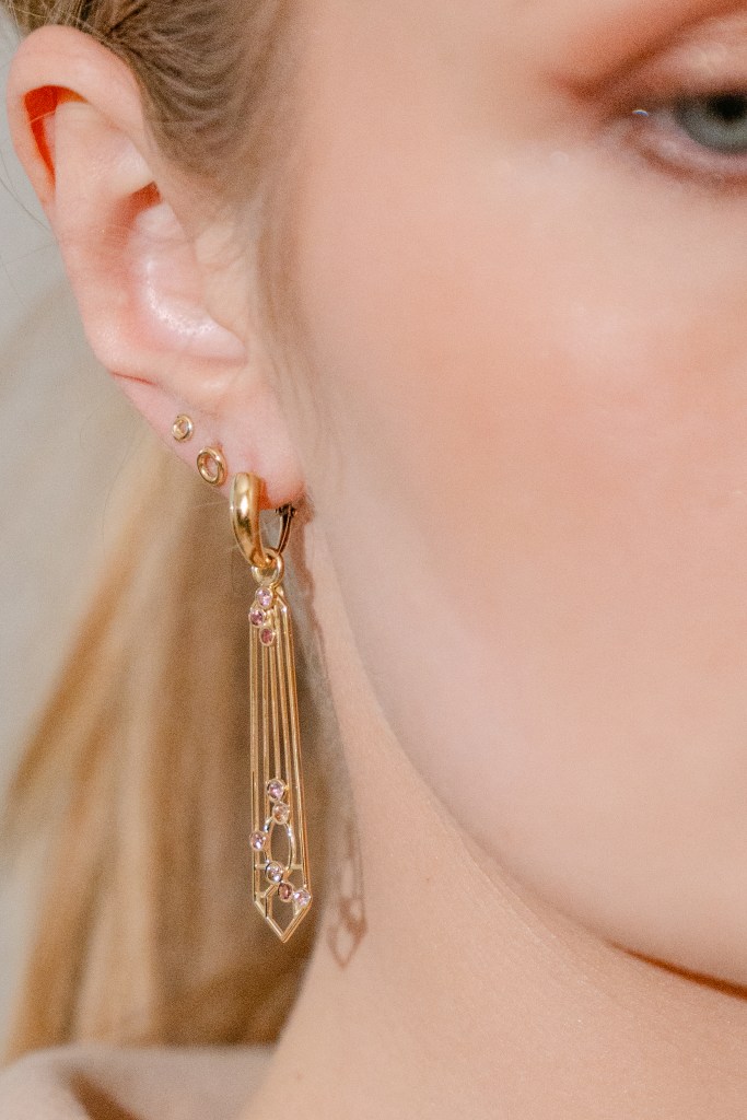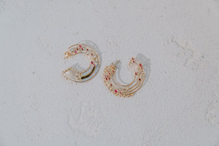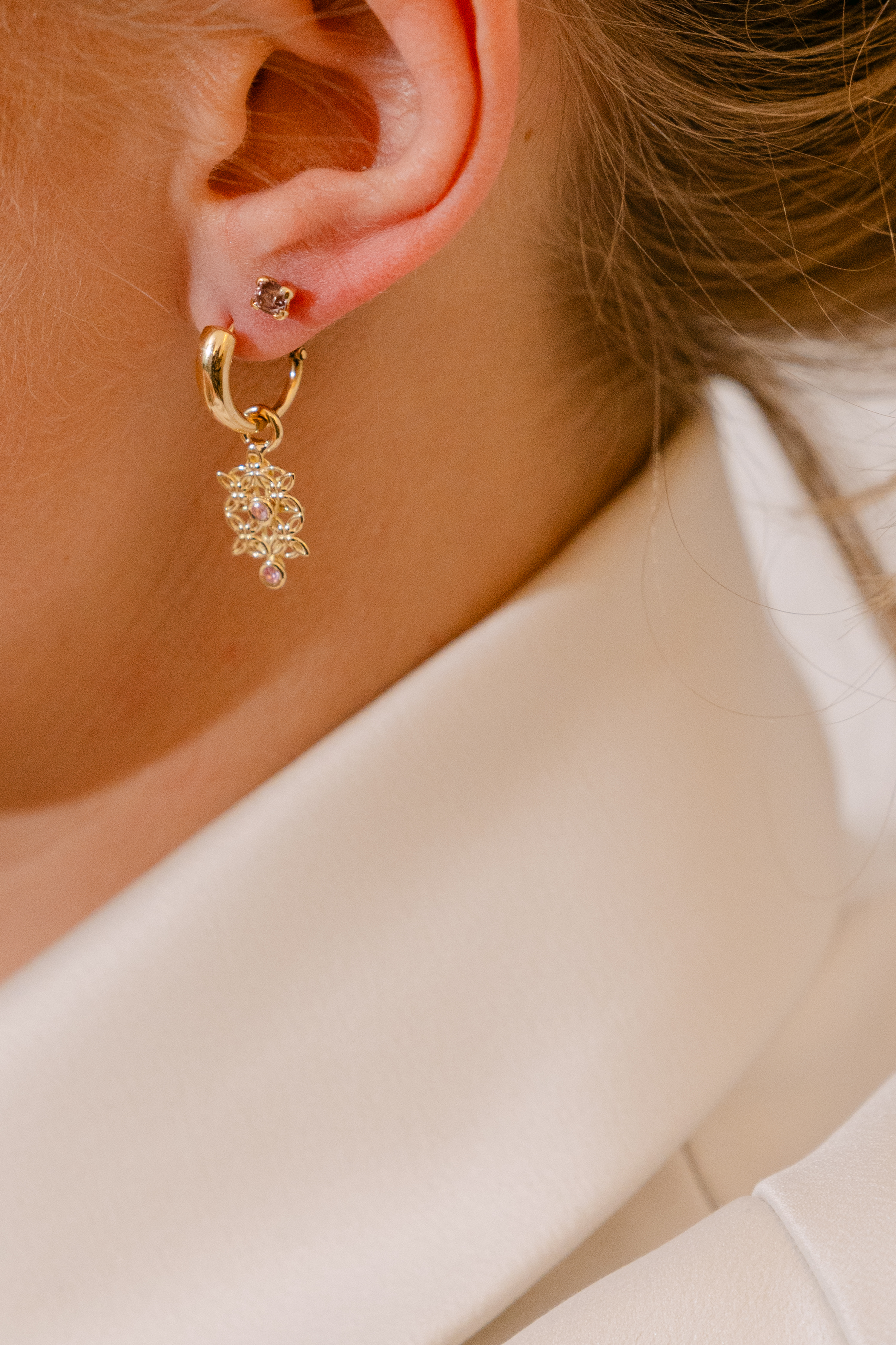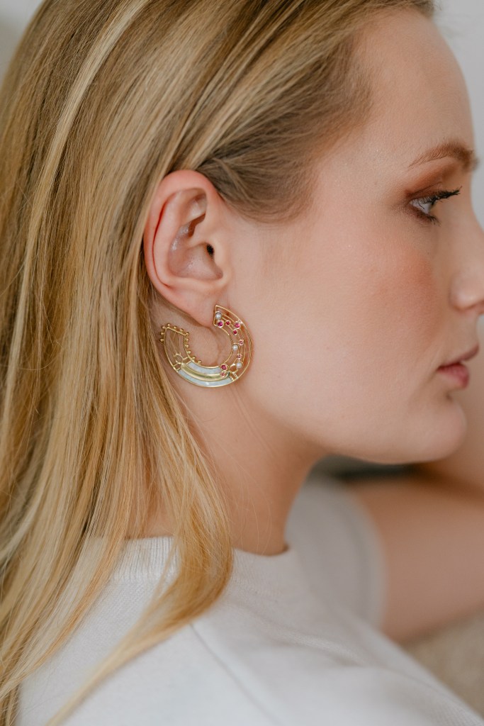 18kt geel gouden oorringen met fuchsia spinellen, witte zoetwaterparels en parelmoerplaatjes