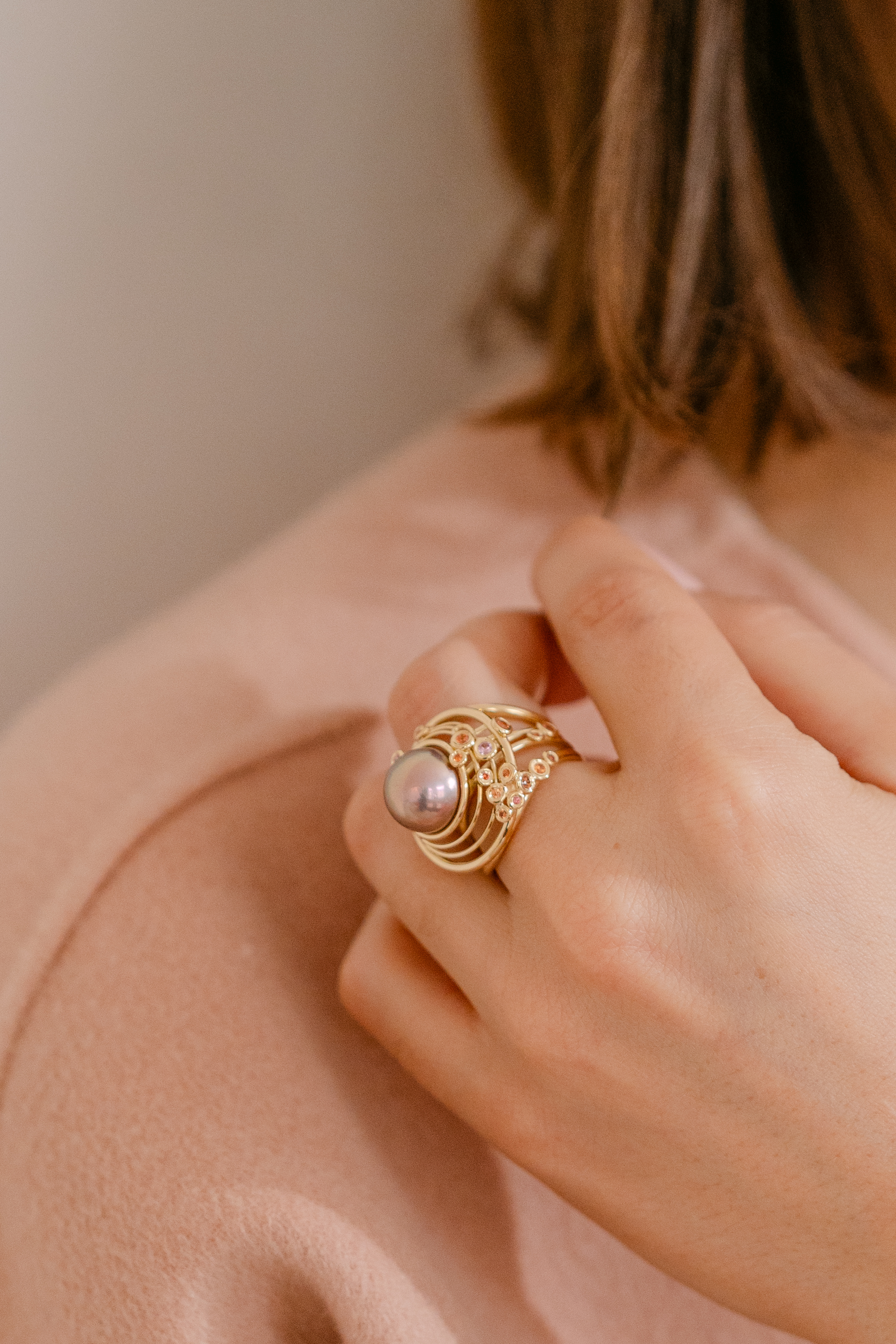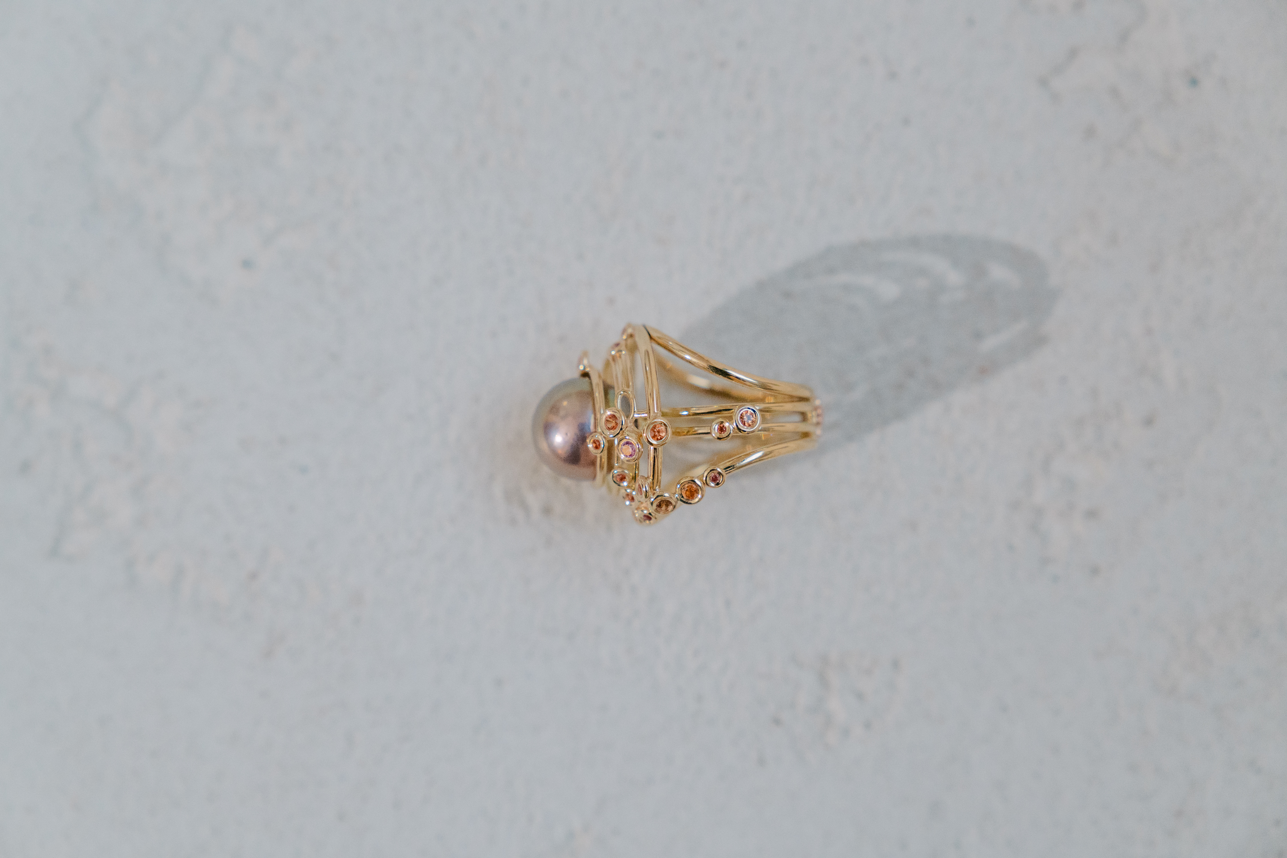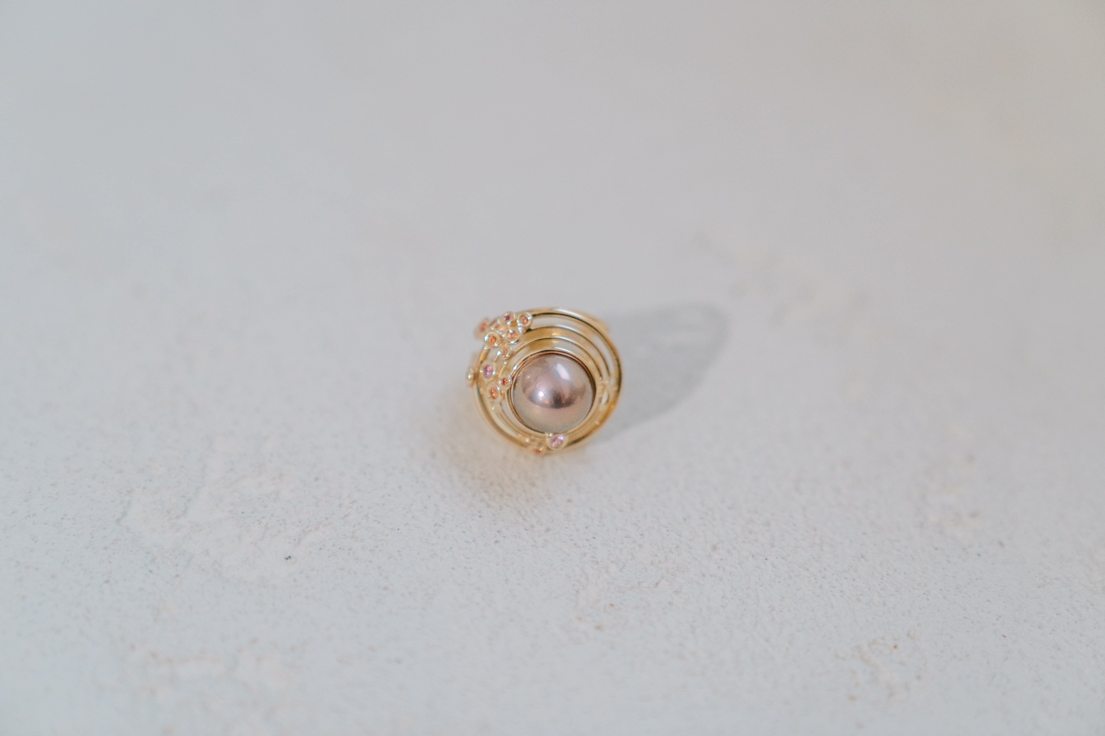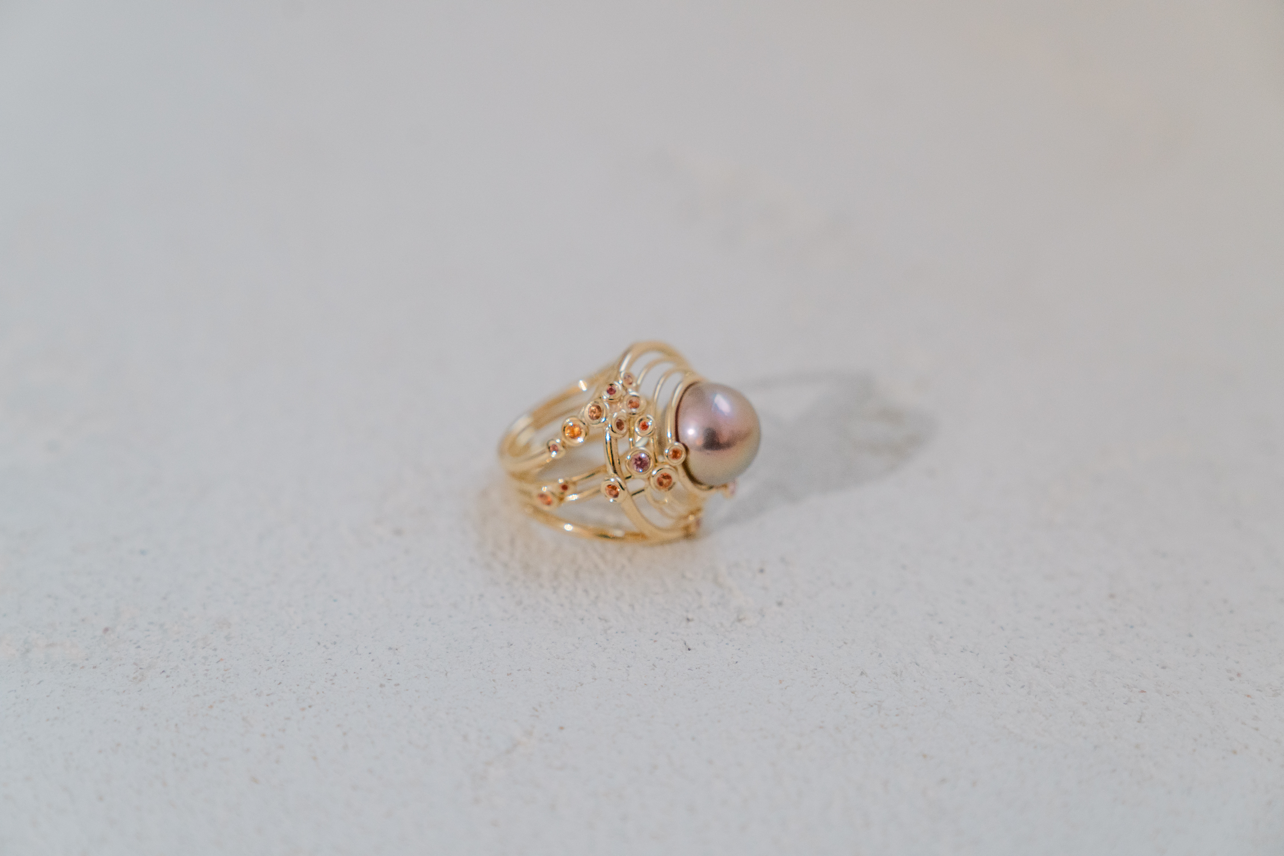 18kt geel gouden ring met Poeder roze Edison parel , roze saffieren en oranje saffieren