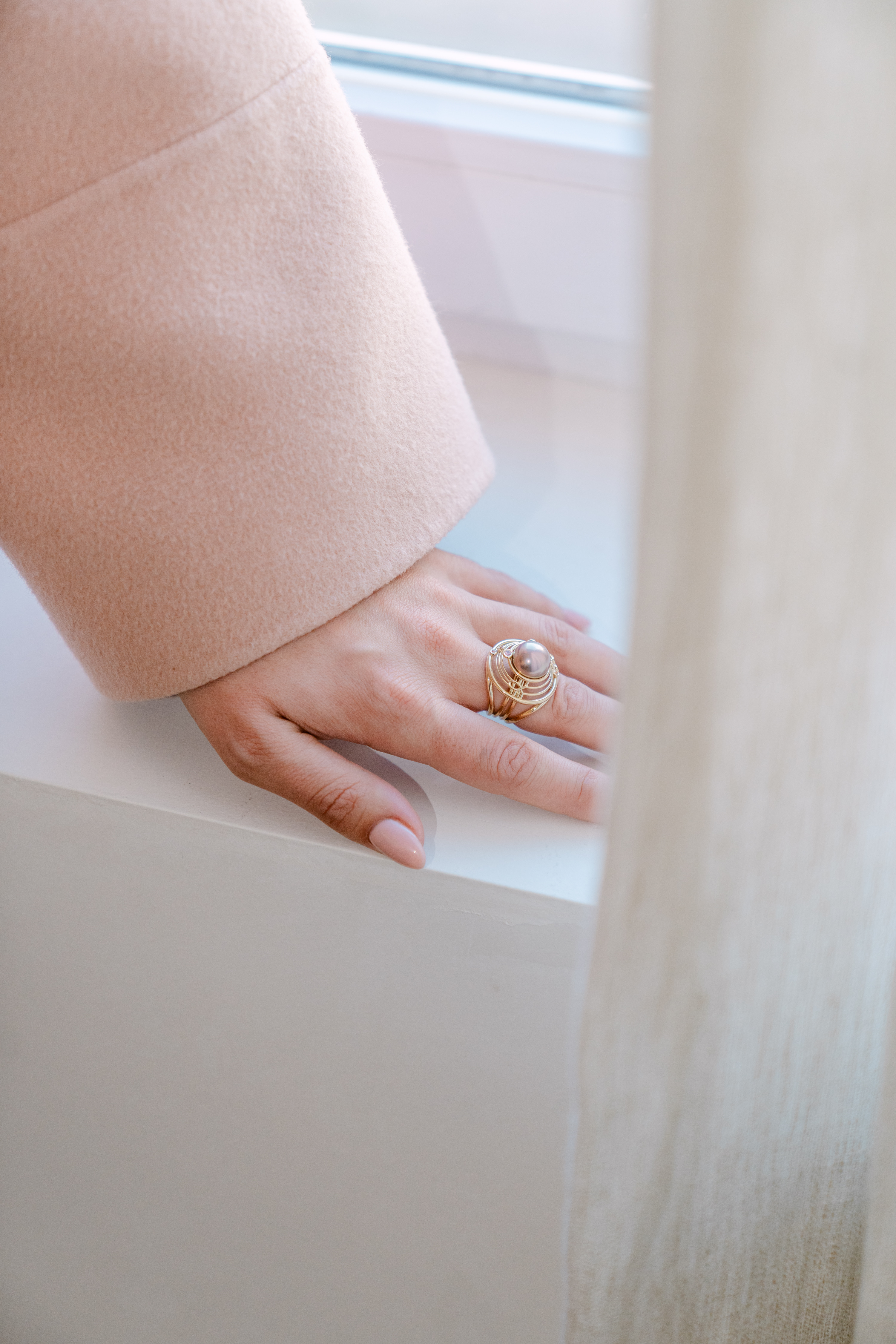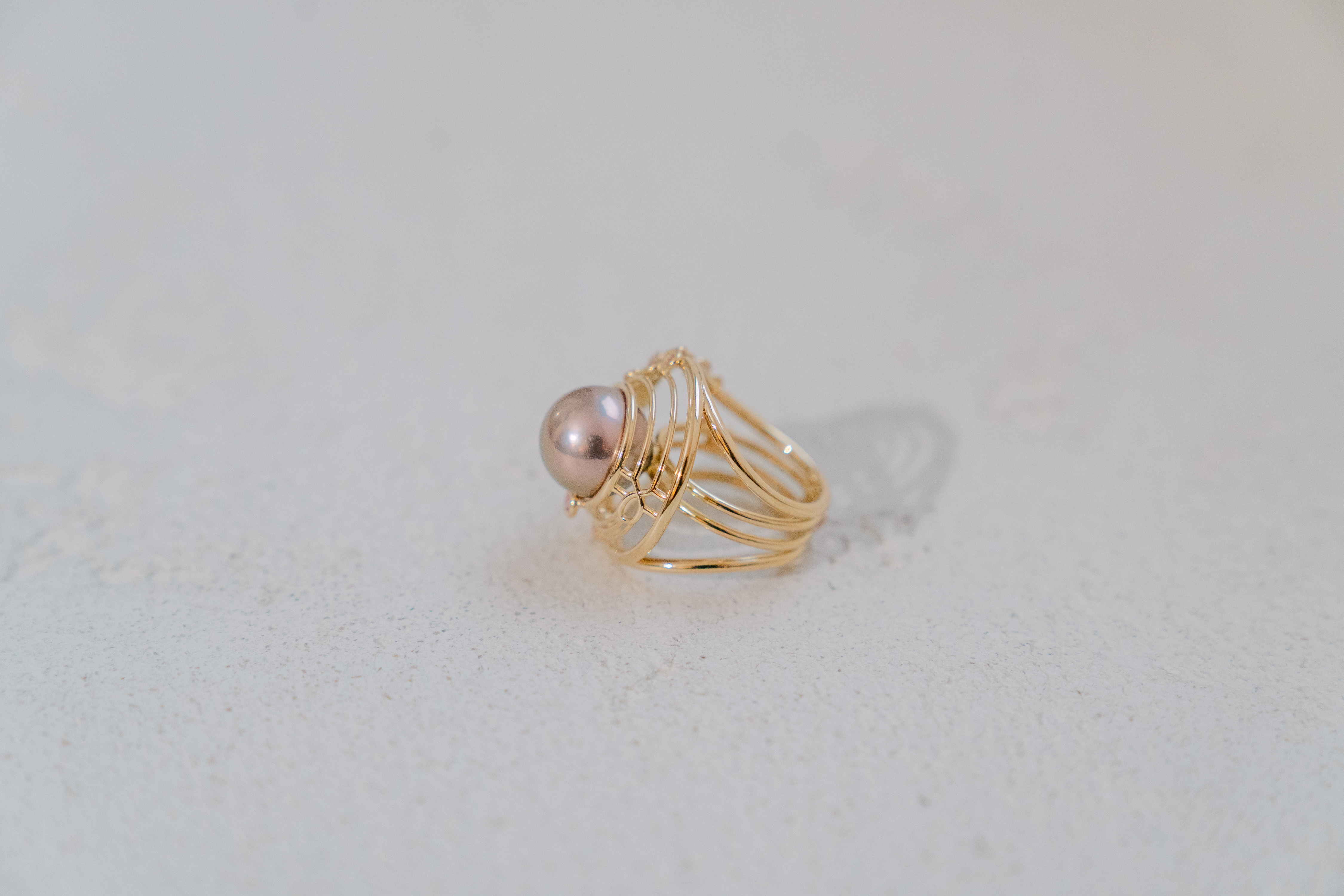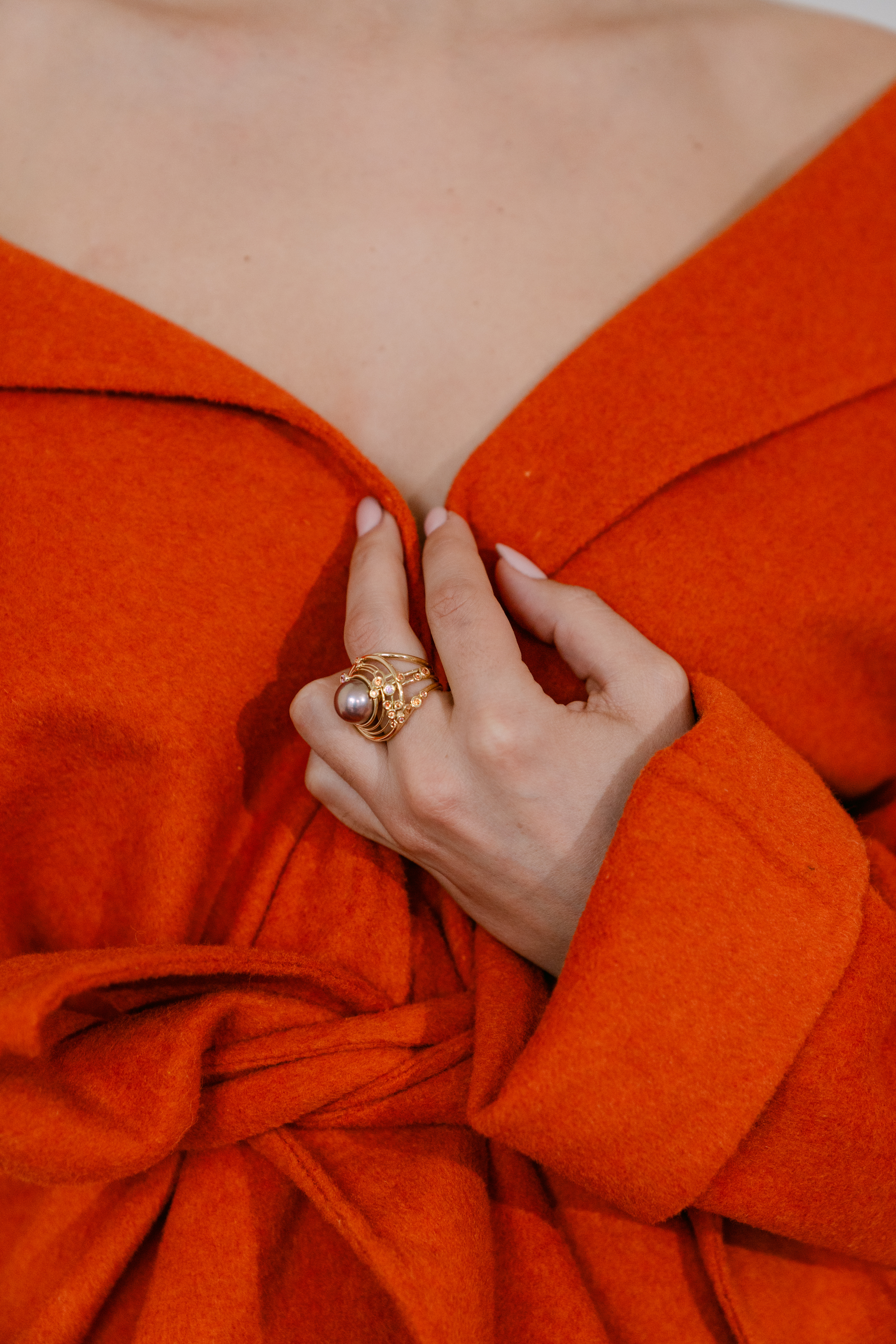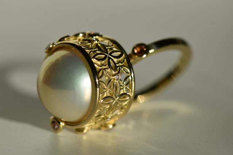 18kt geel gouden ring met Poeder roze Edison parel , roze saffieren en oranje saffieren