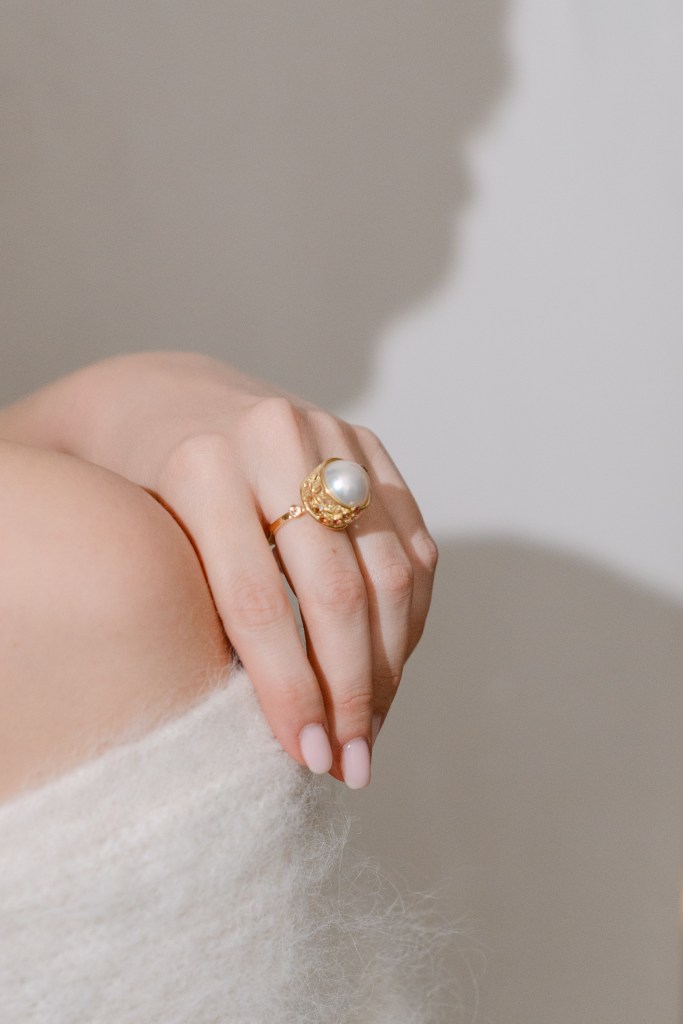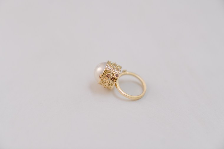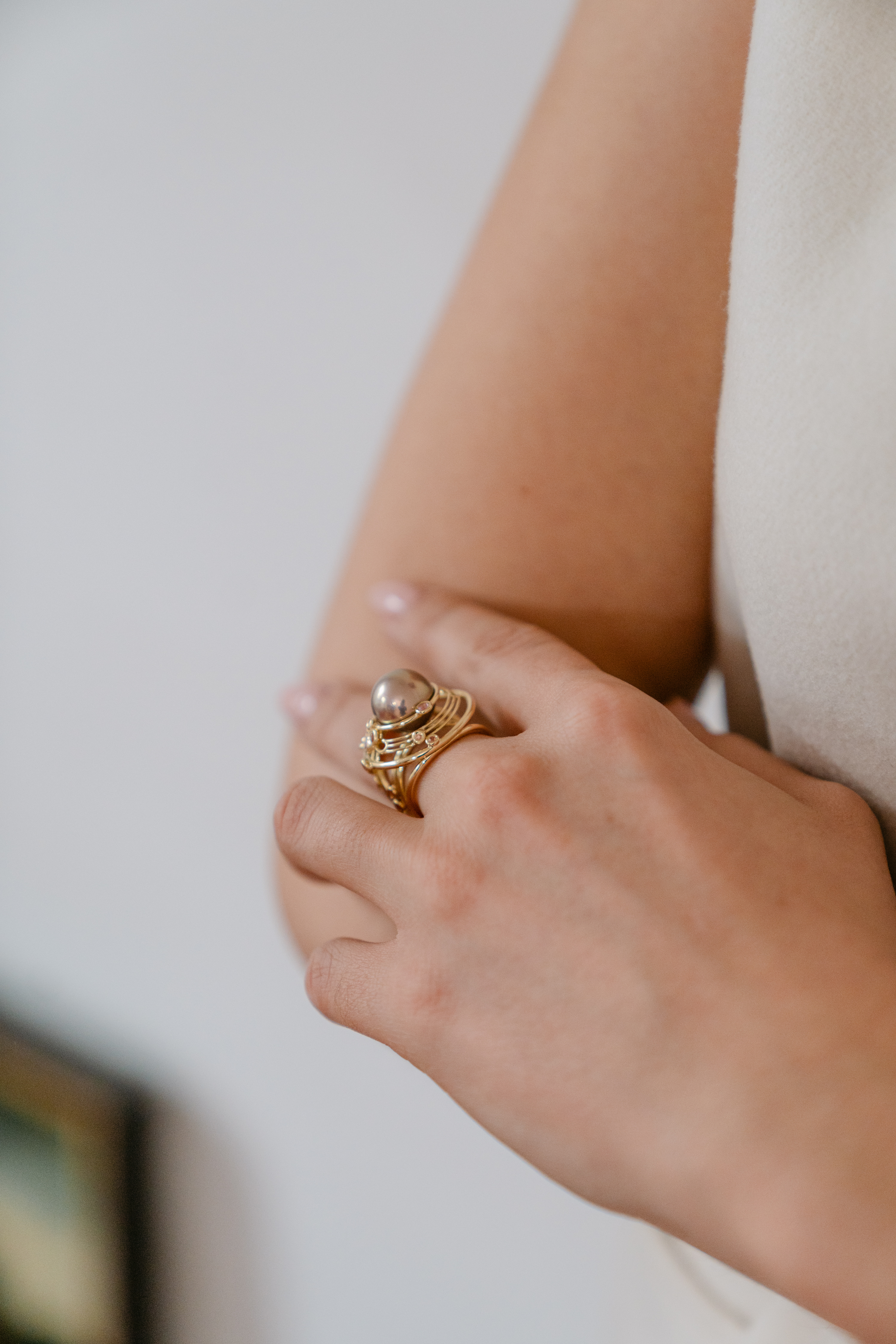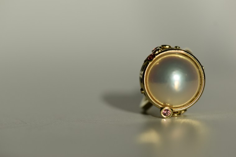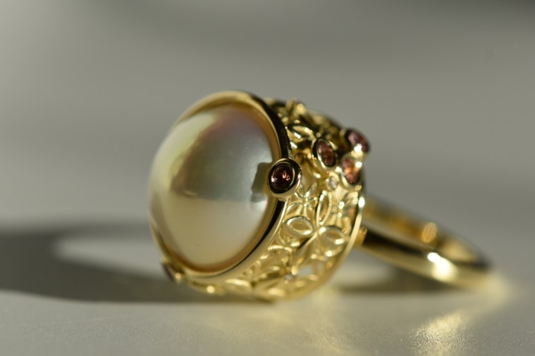 18kt geel gouden ring met top kwaliteit diamantje, saffier, toermalijnen en prachtige grote witte barok zoetwaterparel