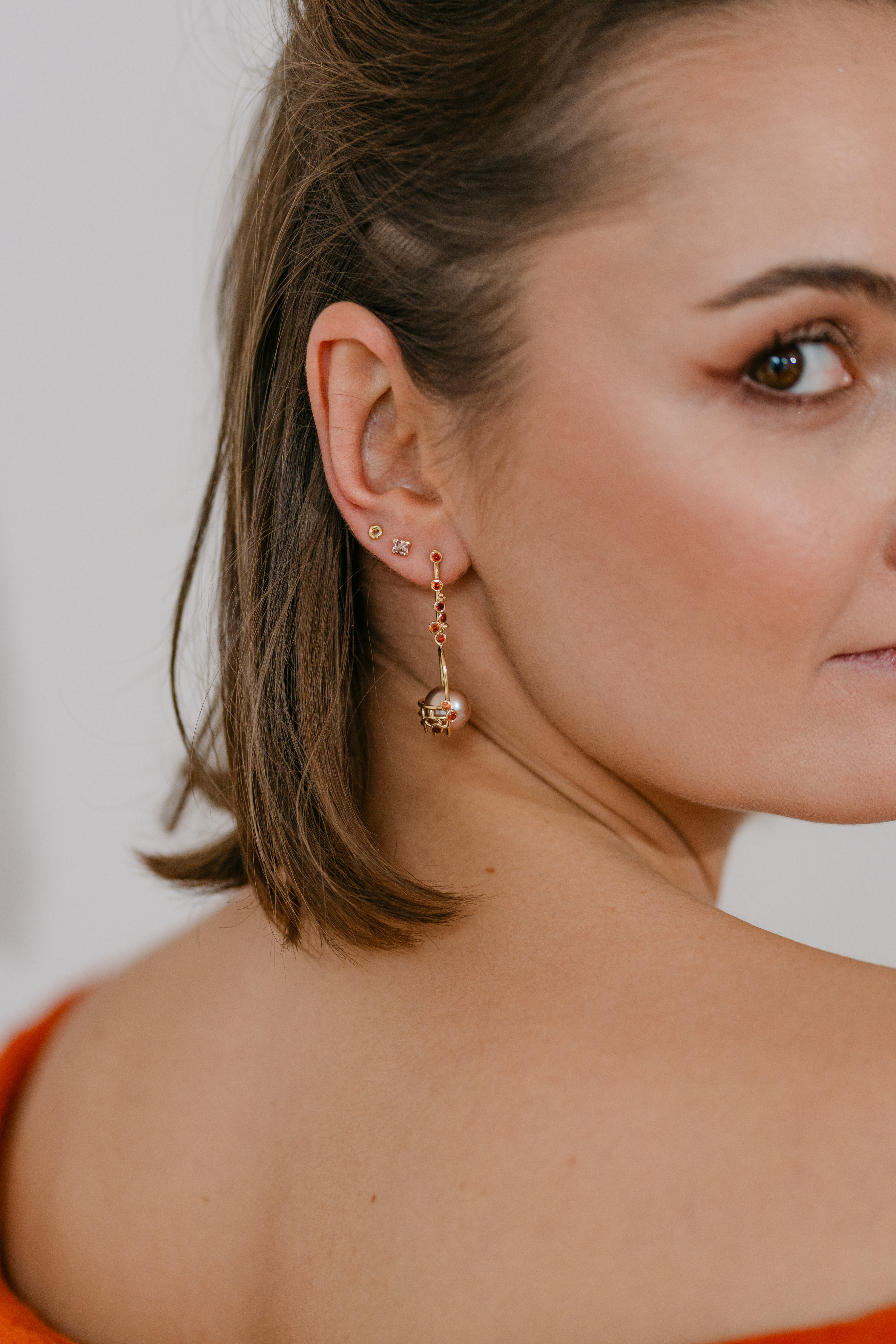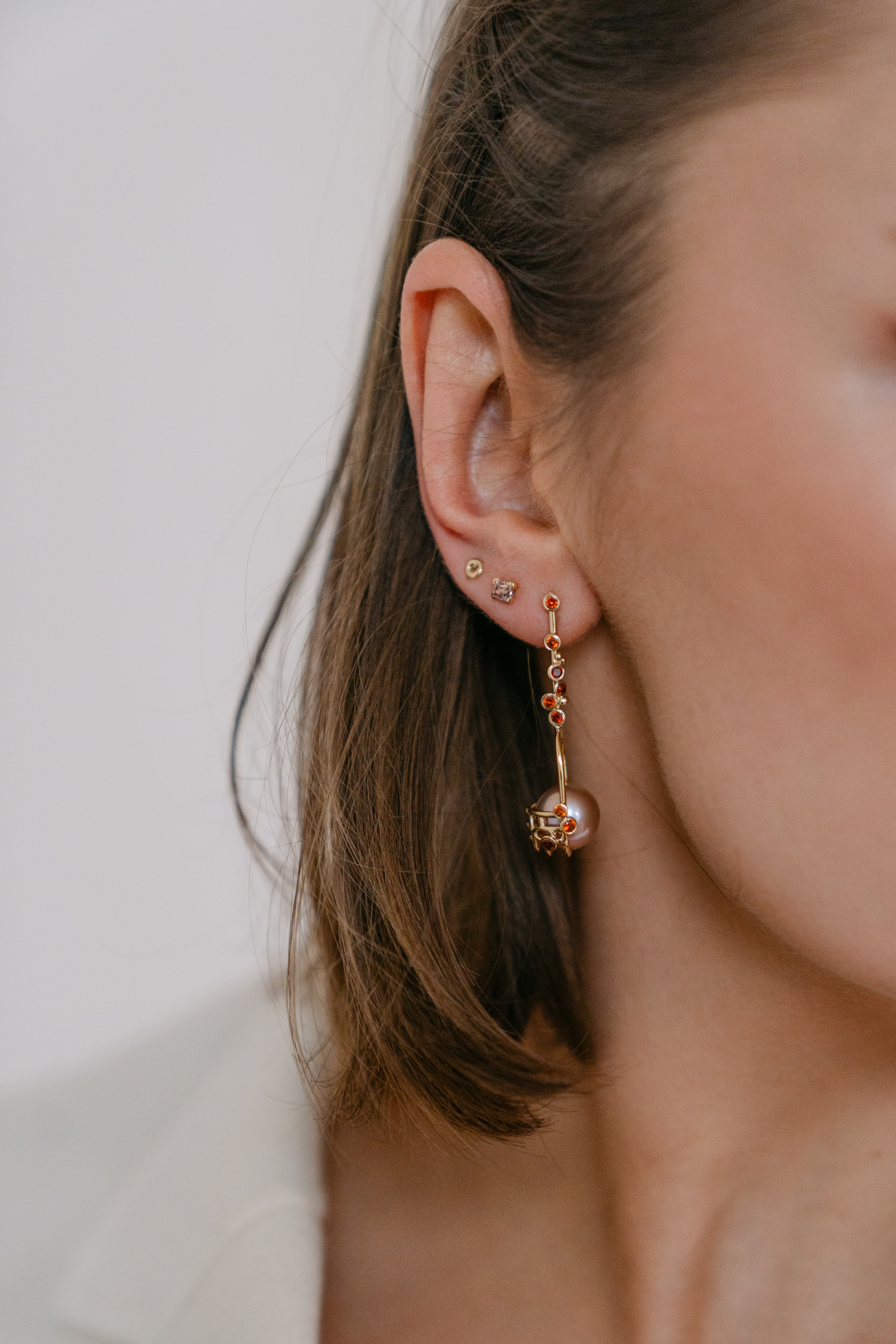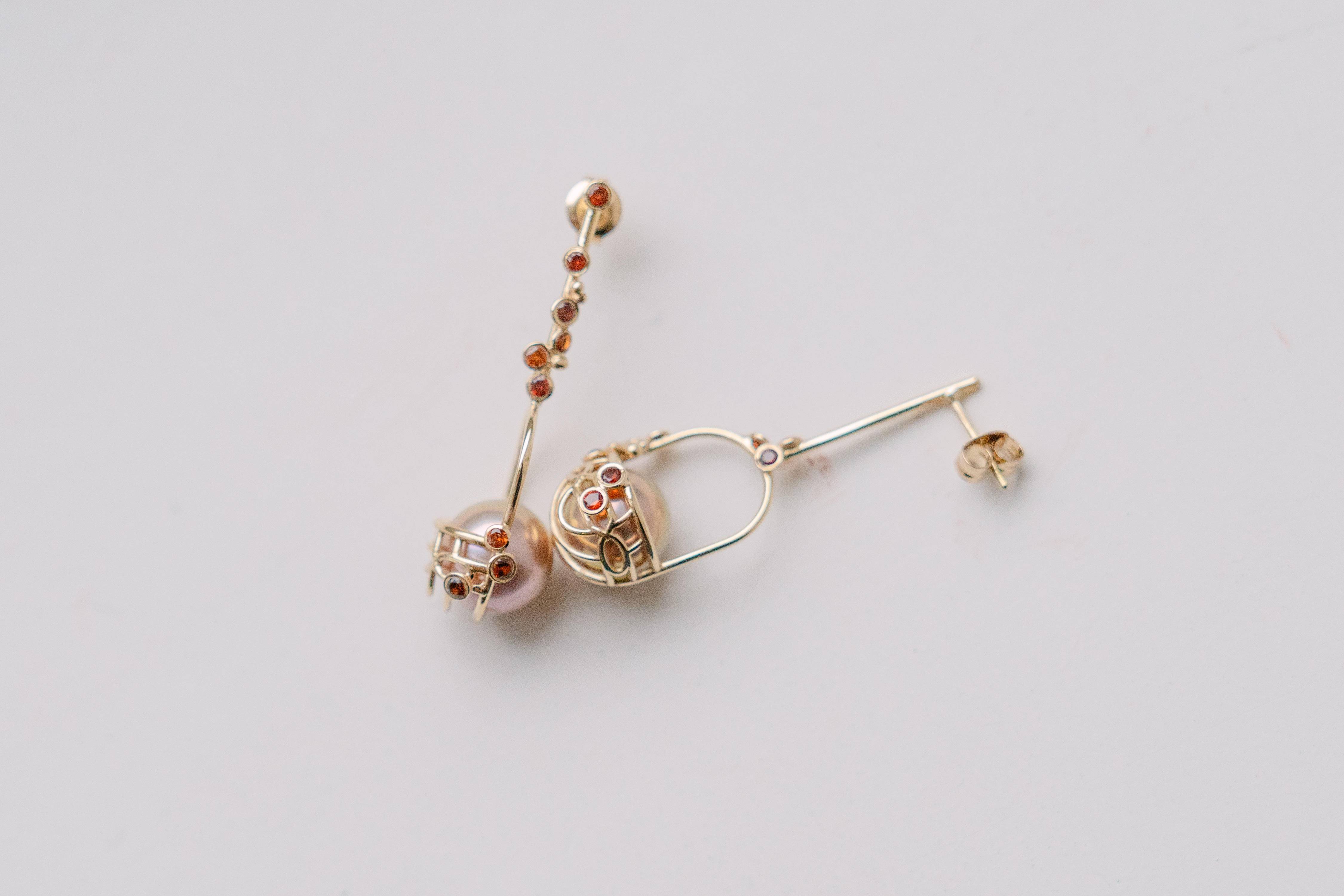 18kt geel gouden oorringen met poeder roze Edison parels en Hessoniet granaat